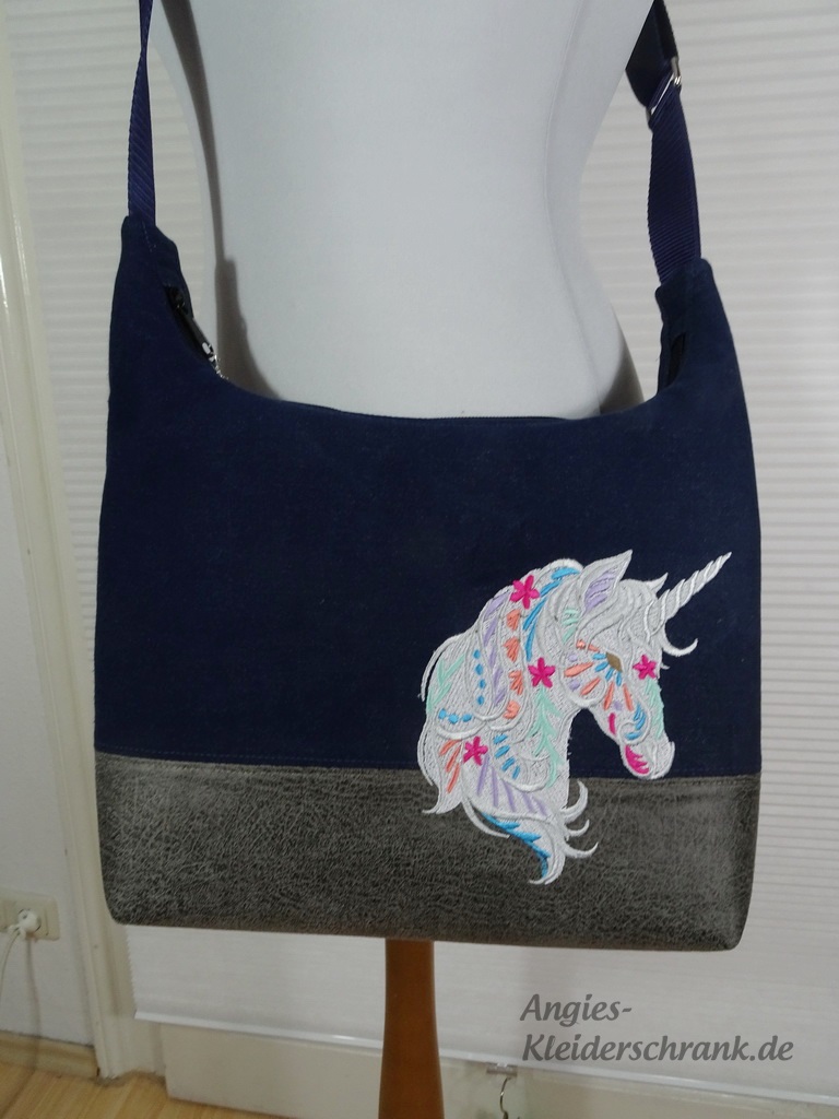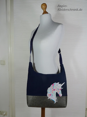 Und weil ich auch den Jeansstoff mal verbrauchen wollte, habe ich gleich noch eine Alles drin Tasche zugeschnitten. Von der Grundidee also wie die von gestern, nur mit anderem Einhornkopf.