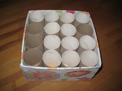 Wir haben da heute was gebastelt. Man braucht einen Karton und leere Klopapierrollen. Idealerweise ist der Karton genauso hoch wie die Rollen.