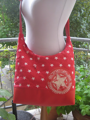Kombiniert mit rotem Kunstleder hab ich daraus eine Alles drin Tasche genäht.