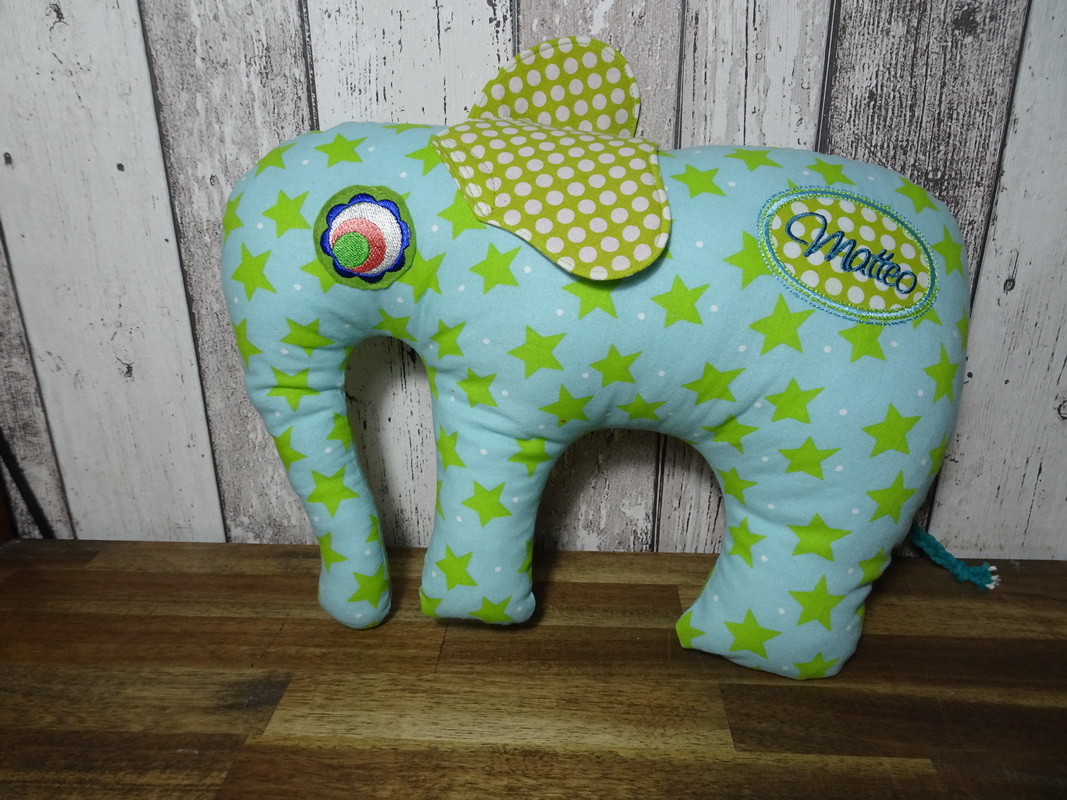 Der kleine Matteo bekommt zu seiner Ankunft hier bei uns auf der Erde einen kleinen Elefanten mit seinem Namen.
