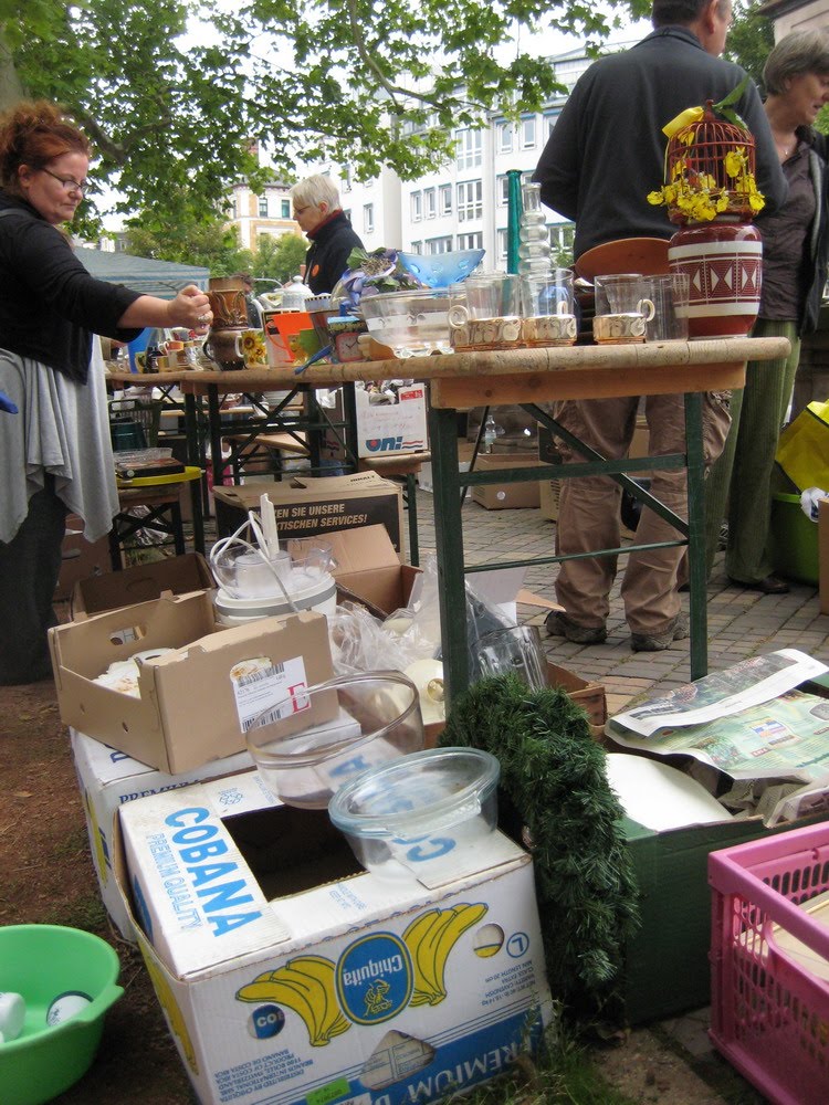 Einmal im Jahr findet hier bei uns ein Flohmarkt zugunsten des CVJM statt. Das ganze findet rund um eine Kirche statt. Dafür sammeln alle Bürger der Stadt das ganze Jahr über und geben dann ihre Spenden beim Verein ab. Da werden also wirklich die Keller gelehrt. Und alles zugunsten der guten Sache verkauft.