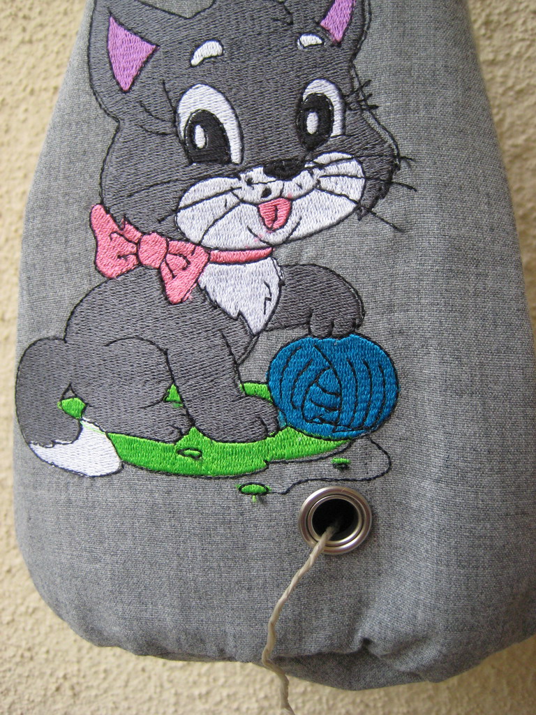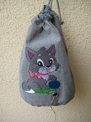 Ein Säckchen für eine dicke Rolle Schnur. Damit die beim Abrollen nicht immer wegkullert. Mit Öse und zum Aufhängen.