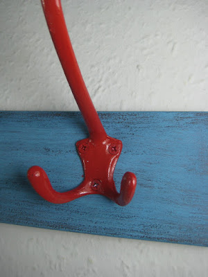 Ich hab es dann dunkel mit vorhandener Farbe gestrichen, später nochmal mit blauer Kreidefarbe drüber. Die Haken sind preiswerte Haken aus dem Baumarkt, die ich mit vorhandener Lackfarbe bepinselt habe.