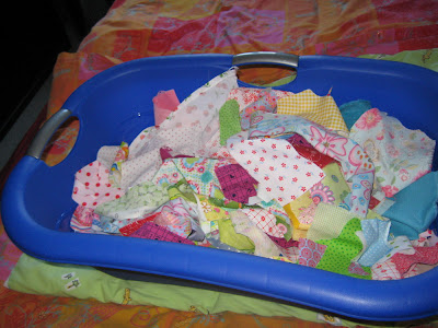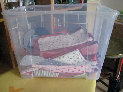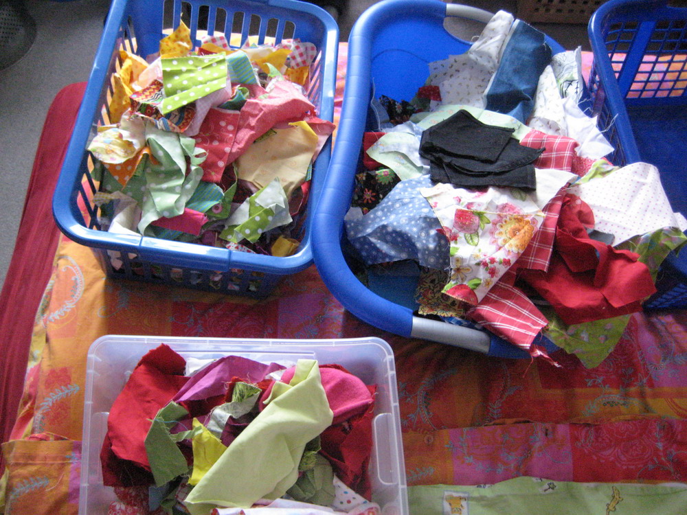 So sieht dann die Kiste mit den großen gebügelten Stücken aus. Was ich daraus mache, weiß ich noch nicht.