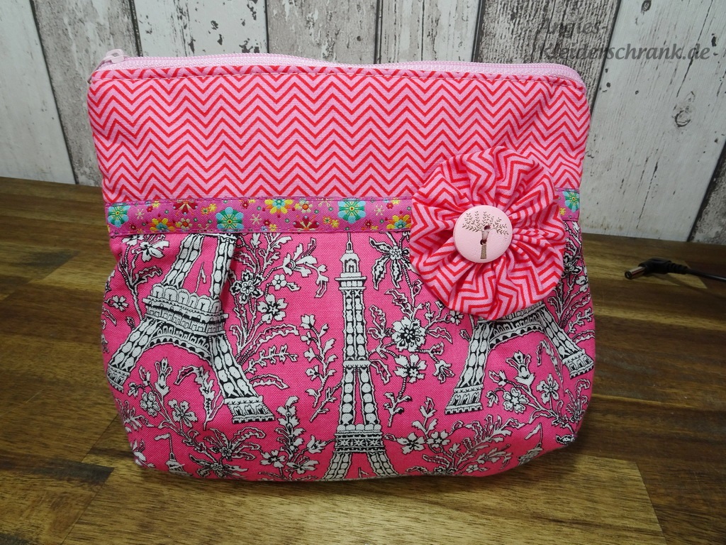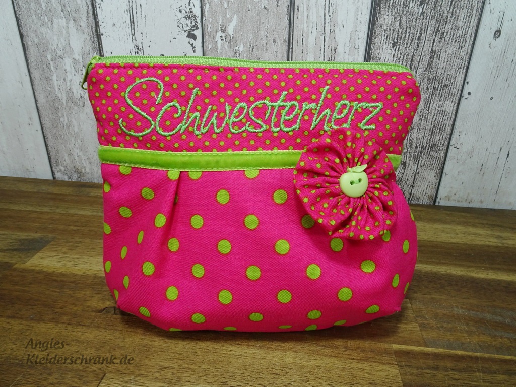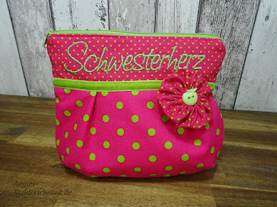 Diesmal sollte es eine Kosmetiktasche sein. Die Vorgaben waren Pink und mit Wunschwort (ein Text ist es ja nicht) bestickt.