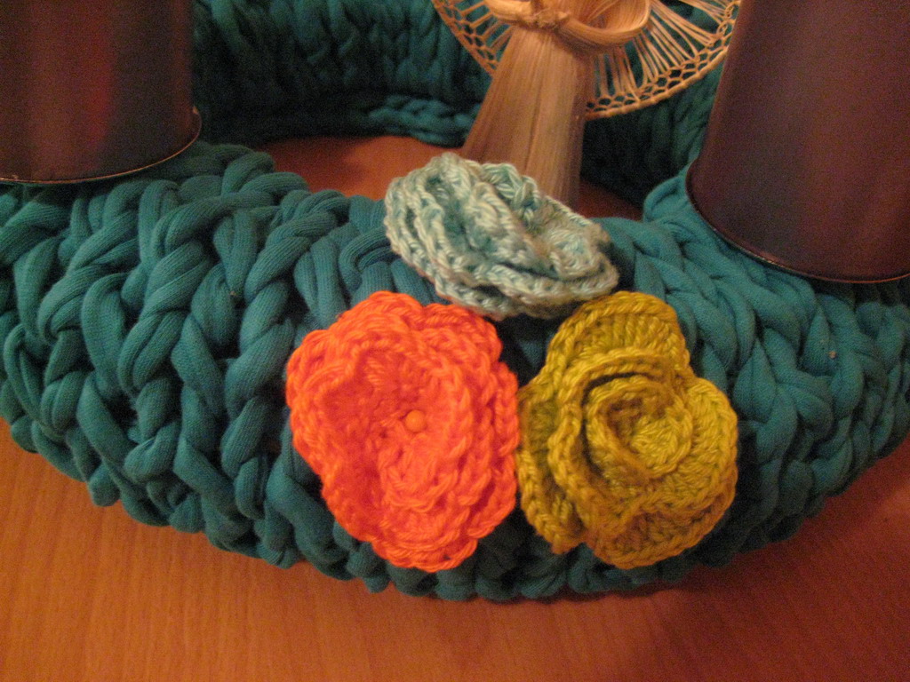 Der Kranz ist gespickt mit kleinen Häkelblümchen. Einen Teil hat Kleinchenoma dazu beigesteuet. Einige hab ich selbst gemacht.