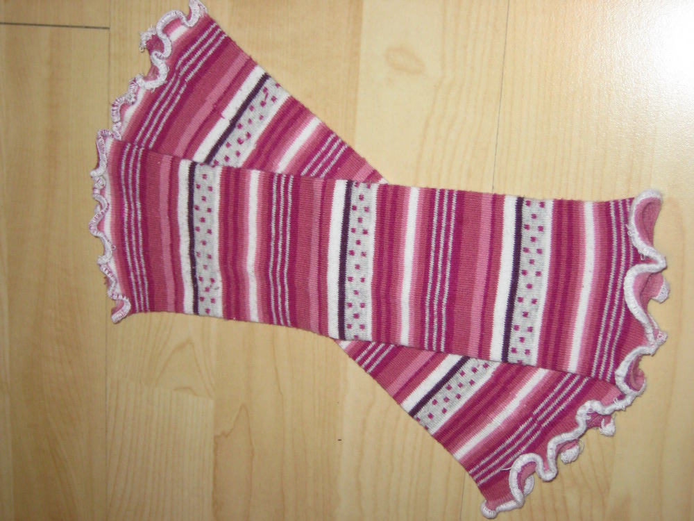 Also, kurzerhand Füße und Oberteil von der Strumpfhose abgeschnitten, oben und unten mit der Ovi einen Rollsaum drangemacht und fertig sind ein paar Stulpen.