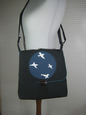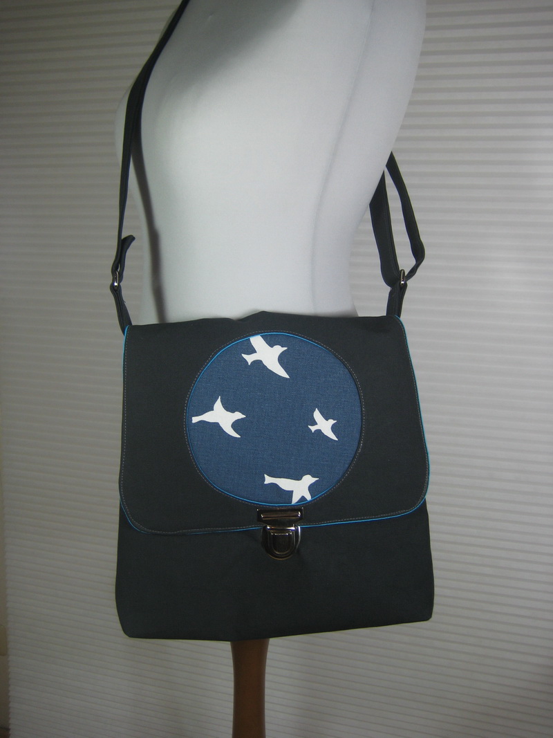 Nochmal eine Bullaugentasche mit Vögeln. Als Besonderheit hat diese Tasche eine extra Reißverschlußtasche auf der Rückseite.