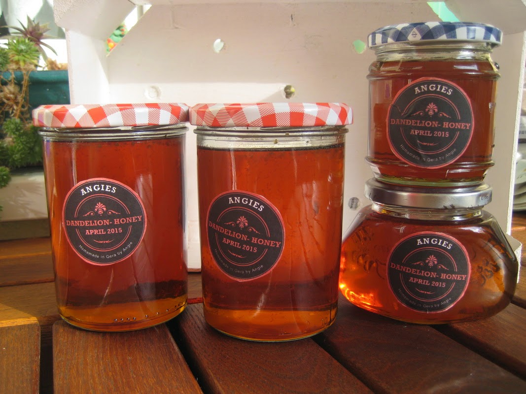 Also hab ich dann daraus Löwenzahnhonig gemacht. Zwei Gläser müßt ihr euch noch dazu denken, die hab ich schon verschenkt.
