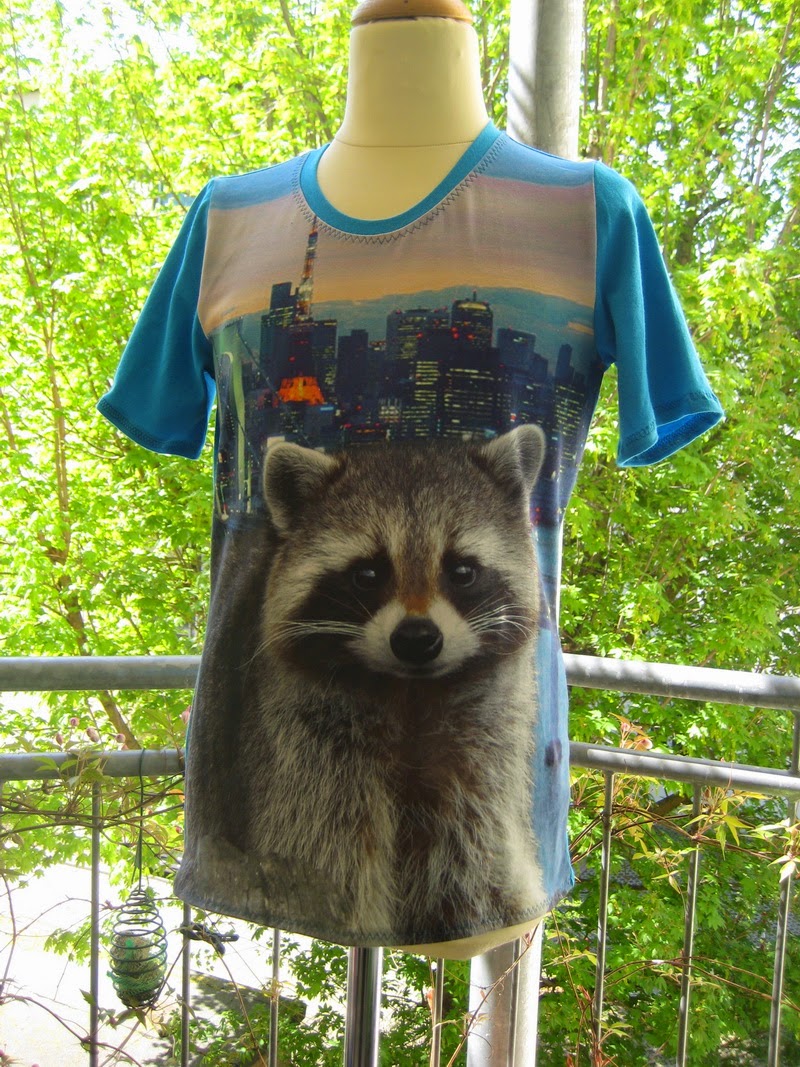 Der Schnitt ist der für mich bewährte Standardschnitt, diesmal mit kurzen Ärmeln. Den Stoff gab es hier. Die Größe passt für eine 140 gerade so. Ich mußte schon die Seiten ein bissl enger machen.