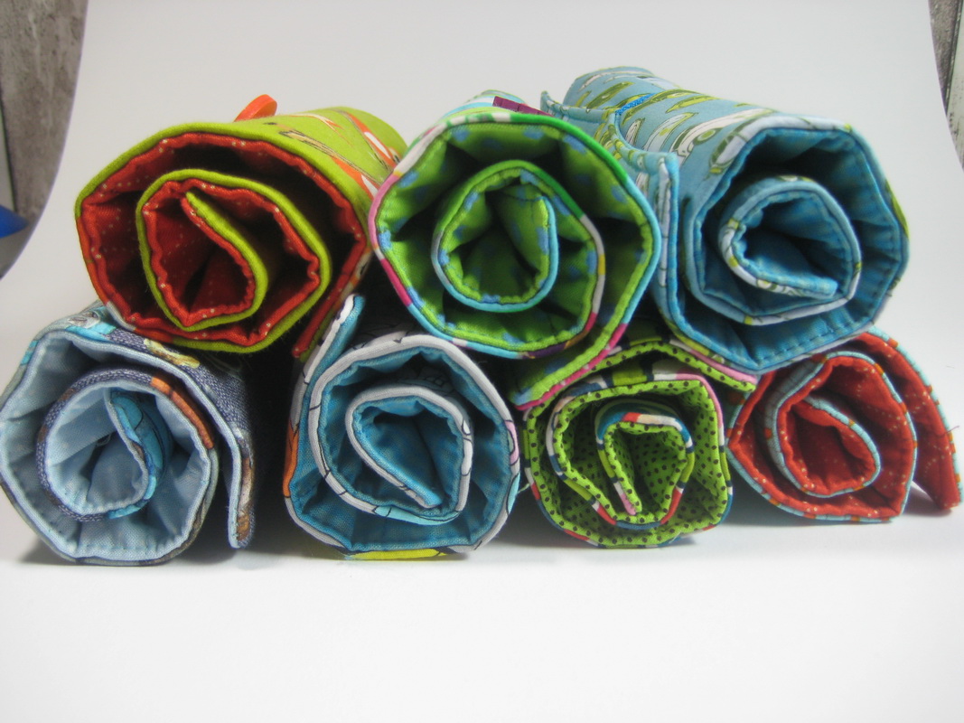 Dafür hab ich noch ein paar Stiftrollen genäht. Wobei, die hab ich die vor ca. einer Woche zugeschnitten und bebügelt. Seitdem dümpeln die auf meinem Nähtisch so rum.