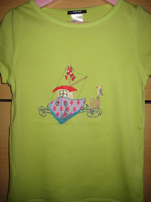 nicht im Bild: wie ich fluche, weil ich die ganze Zeit aufpassen mußte das sich nicht Stoff von T Shirtteilen, die nicht festgestickt werden sollte auf das Stickfeld verirrt. Das Shirt ist nur minimal breiter als der Stickrahmen das ich wirklich meine liebe Not damit hatte.