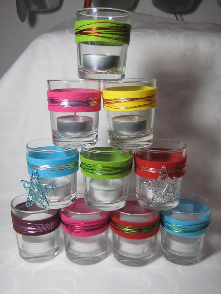 Dazu hab ich Filzreste in Streifen geschnitten, mit Stylefix aufgeklebt und das ganze mehrmals mit buntem Bluemnwickeldraht umwickelt.