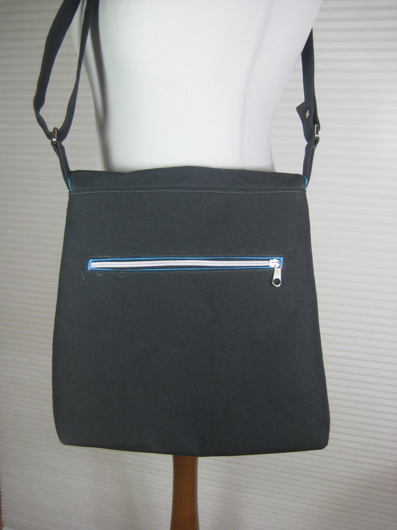 Nochmal eine Bullaugentasche mit Vögeln. Als Besonderheit hat diese Tasche eine extra Reißverschlußtasche auf der Rückseite.